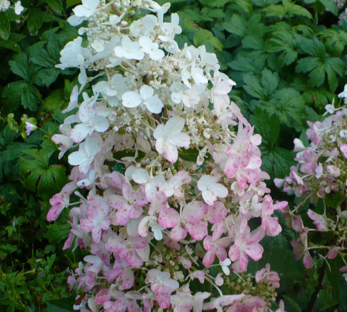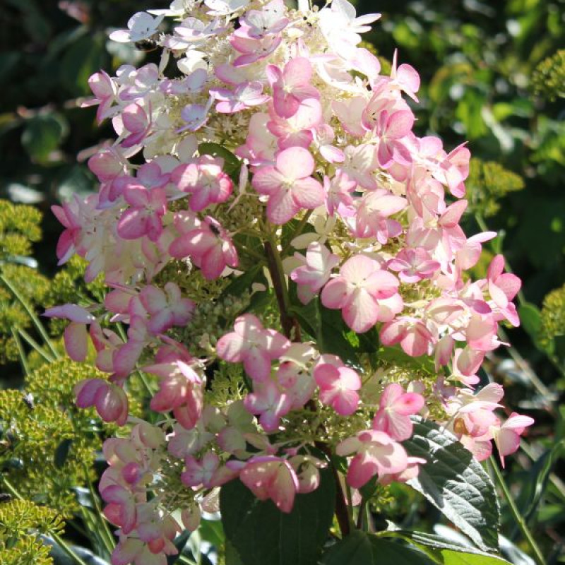 Метельчатая гортензия Angels Blush (ангельский румянец) это феерия из розовых бабочек, порхающих над зеленой листвой. Соцветия неплотные, что придает им легкость и воздушность, они не поникают к земле после дождя, не нуждаются в подвязке и не ломаются при сильном ветре. Также одним из достоинств этого сорта является его любовь к солнцу. Под летними лучиками ее цвет становится более насыщенным и сочным, что придает всему кусту большую выразительность. Сами цветочки очень интересные, с краев они ярко розовые, а ближе к центру светлеют практически до белого. Куст достигает в высоту до 1,5 метров, а в ширину примерно 1 метр. Цветение очень продолжительное с июля по октябрь и обильное при правильной подкормке. Соцветия можно использовать в качестве гербария и декора, т.к после высыхания они отлично держат форму.