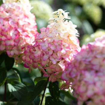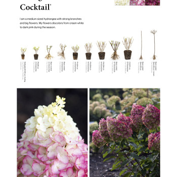 Новинка. Куст среднего размера высотой 100 см и шириной 100 см. Отличается сильными побегами, способными хорошо держать плотные соцветия размером 20-30 см. Распускается кремовой и далее меняет цвет от нежно-розового до темно-малинового.