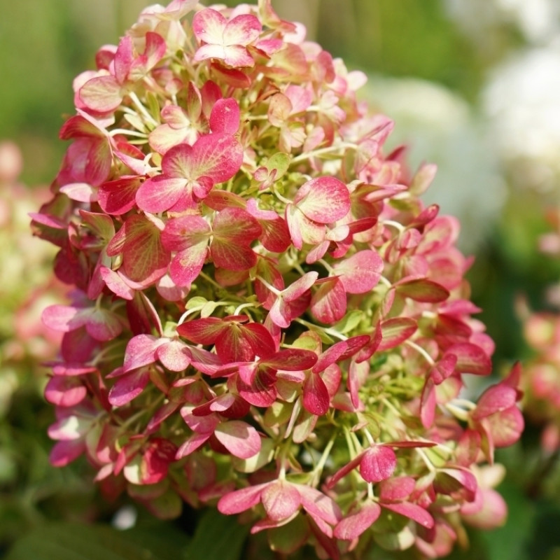 Карликовый кустарник, достигающий высоты 1 м и 1м по ширине. Прямые, жесткие стебли. Листья темно-зеленые, яйцевидные. Стерильные цветки, собранные в конусовидные соцветия.. Соцветия вырастают до 25-30 см длиной, первоначально лимонно-зеленые, белоснежные в полном расцвете с аквамариновыми кончиками, к концу лета они становятся розовыми с зелеными и белыми прожилками. Почти все однолетние побеги увенчаны соцветиями. Цветение начинается в июле и продолжается до сентября. После цветения цветки высыхают, оставаясь украшением куста в течение осени и зимы.