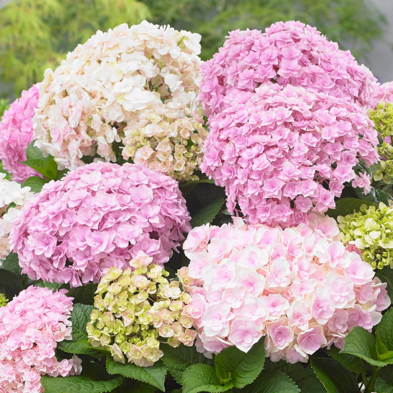 Удивительная новая трехцветная гортензия с великолепными цветками сливочно-белого, зелено-желтого и разных оттенков розового с июня по сентябрь. Часто радует повторным цветением в коне лета.