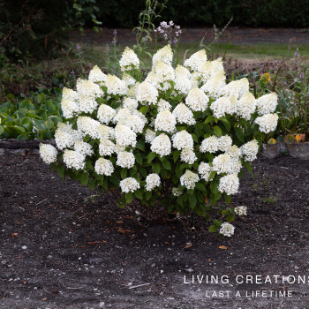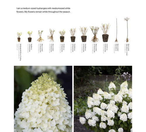 Сорт имеет компактный размер куста. Очень обильно цветет плотными соцветиями среднего размера. Окраска цветков большую часть сезона белая и только к концу цветения проявляется розовато-карамельный оттенок.