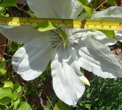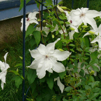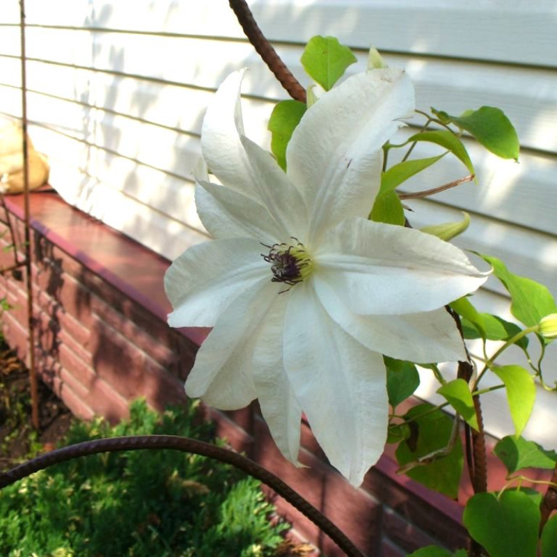 Белые цветки, очень большие (диаметр до 28 см), покрывают растение снизу. Лепестки с легкими волнистыми краями. Цветет обильно в мае-июле, летом цветение повторяется, но оно слабее. Высота побегов 2-3 м, не любит ветреных участков, очень солнечных и горячих. Морозостойкое растение.