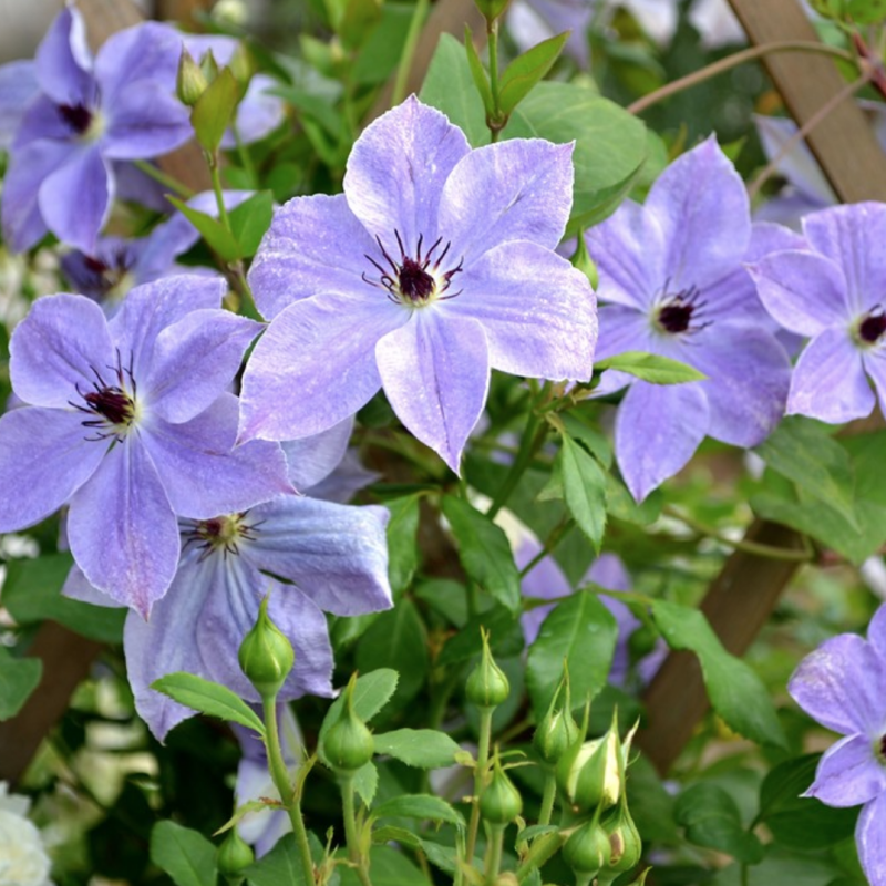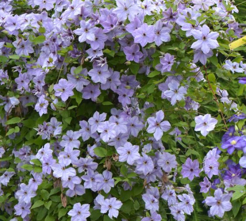 Самый новый сорт питомника Марчинского. Цветки диаметром 10-12 см, светло-голубые со светло-фиолетовыми тенями и розовыми прожилками. Лепестки в количестве 4-6, эллипсовидные, заострённые, со слегка волнистыми краями, снизу светло-голубые с почти белой полоской по центру. Тычинки контрастные. Пыльники тёмные фиолетово-пурпурные на зелёно-белых тычиночных нитях. Цветение обильное с конца июня до конца июля и продолжается более слабое до конца августа. Листья тёмно-зелёные, молодые – с красной каймой. Молодые побеги зелёно-пурпурные. Относительно малотребовательный и сильный сорт. Может подниматься по натуральным опорам (например, большой кустарник или дерево). Особенно красиво выглядит на светлом фоне.