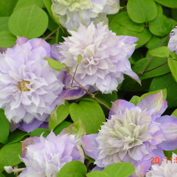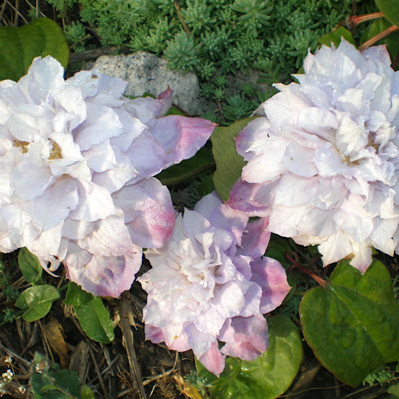 Интересный сорт, образующий в июне-июле на прошлогодних побегах махровые, крупные, фиолетово-белые цветки. Повторяя цветение в августе, имеет цветки той же окраски, но одиночные.