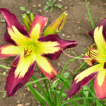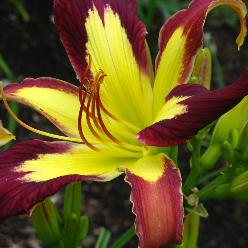Для любителей Спайдеров (лилейников с длинными узкими лепестками). Пурпурно-бордовый с зеленовато-жёлтой звездой в центре. Цветок огромный, от 28 см в диаметре.