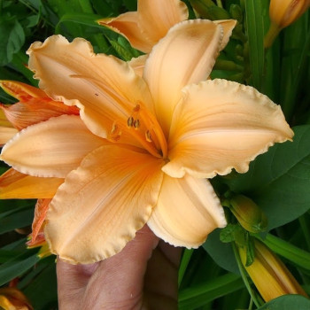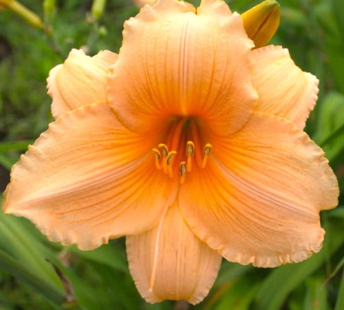 Сорт неизменно притягивает взгляд, смотрится нежно и утонченно, он словно светится изнутри. У цветка плотные лепестки с выразительным жилкованием, прекрасно держат непогоду. Диаметр около 13 см. Мелкая красивая гофрировка.