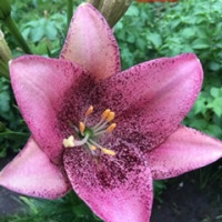 Красивая лилия, цвет очень не однородный, насыщенный, распыленный. Интересная форма лепестков, немного изогнутая, как будто ваза неправильной формы.
