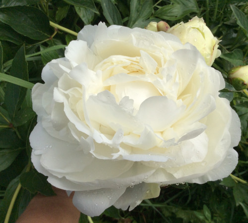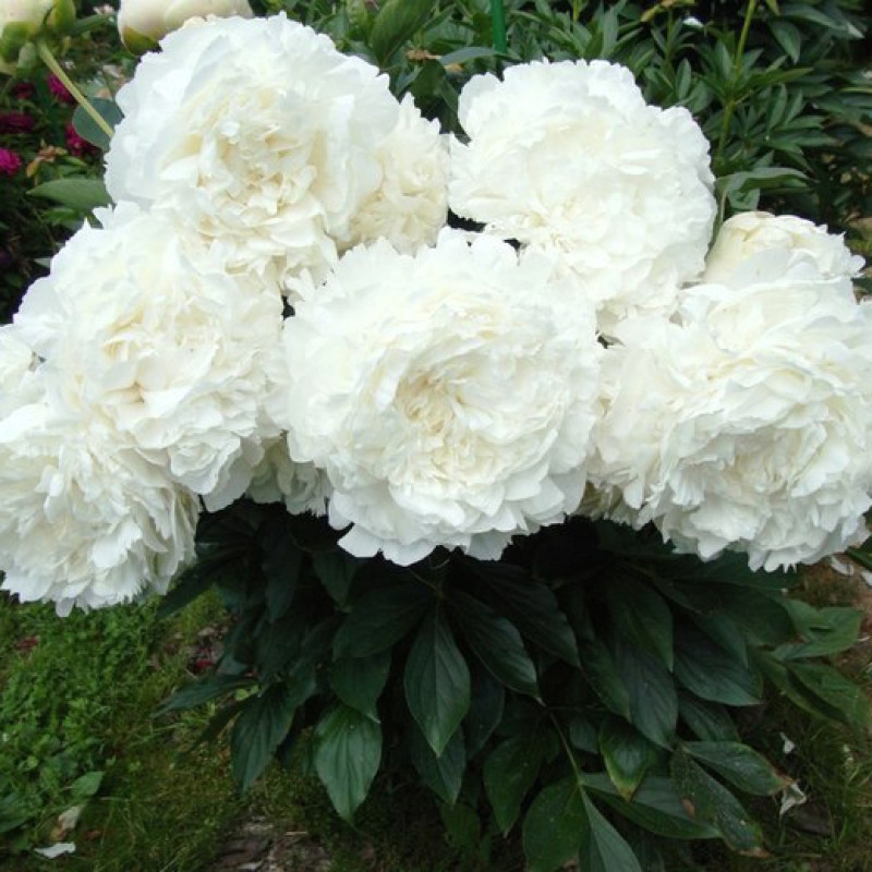 Очень ароматный,  напоминает запах розы, что просто удивительно, таких пионов больше нету! Густо махровый белый, обладает большими соцветиями. Огромные цветки нуждаются в поддержке. Куст очень цветообильный, при правильных подкормках вы не увидите листву за огромными белыми цветами.