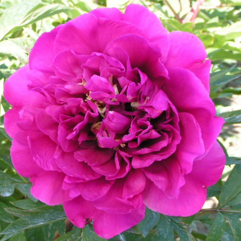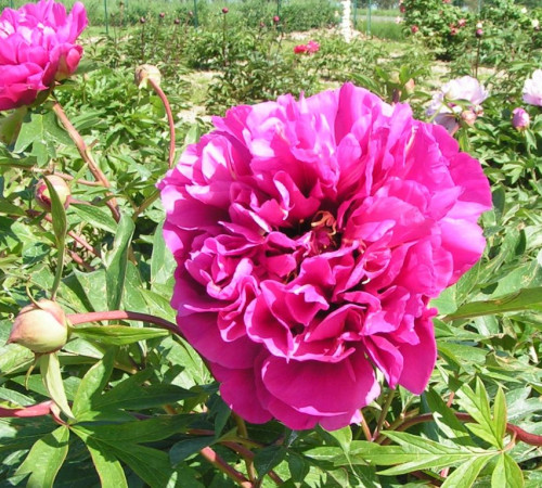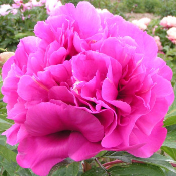 Пион «Belle Toulousaine» - это ито-гибрид, ранне-среднего срок цветения. Цветы очень выразительные с фуксиевыми цветками. Ароматный. Большие цветки размером 20 сантиметров, крепкие стебли отлично справляются с этими огромными цветками.