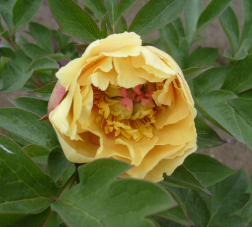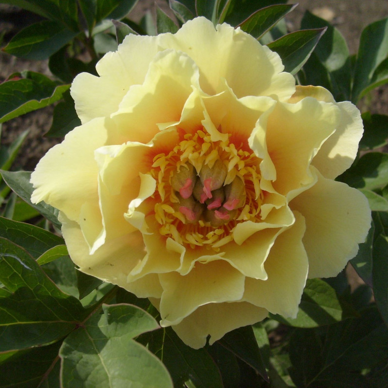 Itoh Hybrid. Полумахровый. Родители, сорт Paeonia lactiflora x P. (гибрид Lutea) ‘Alice Harding’. Первое цветение в 1974 году. Лепестки желтые, более светлые на внешних концах с крупными красными бликами и заметным центром из покрытых оболочкой плодолистиков. Цветки среднего размера на стеблях длиной 60 см, расположены близко к крупным листьям. Стебли образуют широкий низкий куст, очень вынослив и не подвержен суровому зимнему климату, где бы его ни пытались выращивать. Темно-зеленые листья сохраняют свой внешний вид до сильных заморозков, что вместе с формой куста делает его отличным растением для ландшафта.