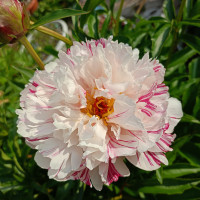 Сорт экзотика, яркое и необычное пятно в вашем саду. Белые или кремовые лепестки расчерчены малиновыми мазками. Цветок махровый в самом центре замаскированы тычинки. Обладает легким ароматом. Его яркая, красочная окраска подарит позитив на весь день.