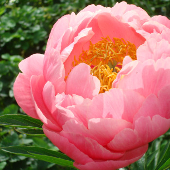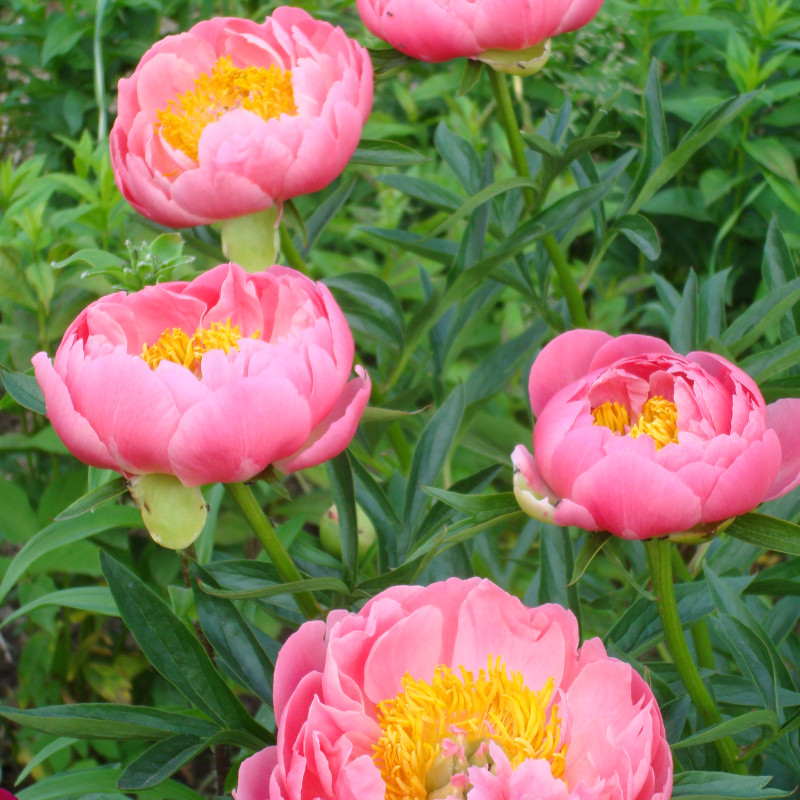 КОРАЛЛОВО-ЛОСОСЕВЫЙ. Полумахровый. Цветок чашевидный, лососево-розовый, в центре рыжеватые мелкие тычинки. Стебли крепкие устойчивые, могут краснеть у основания. Листья удлиненные.