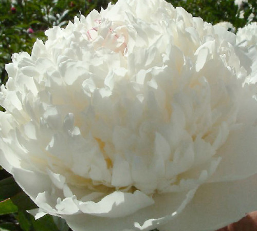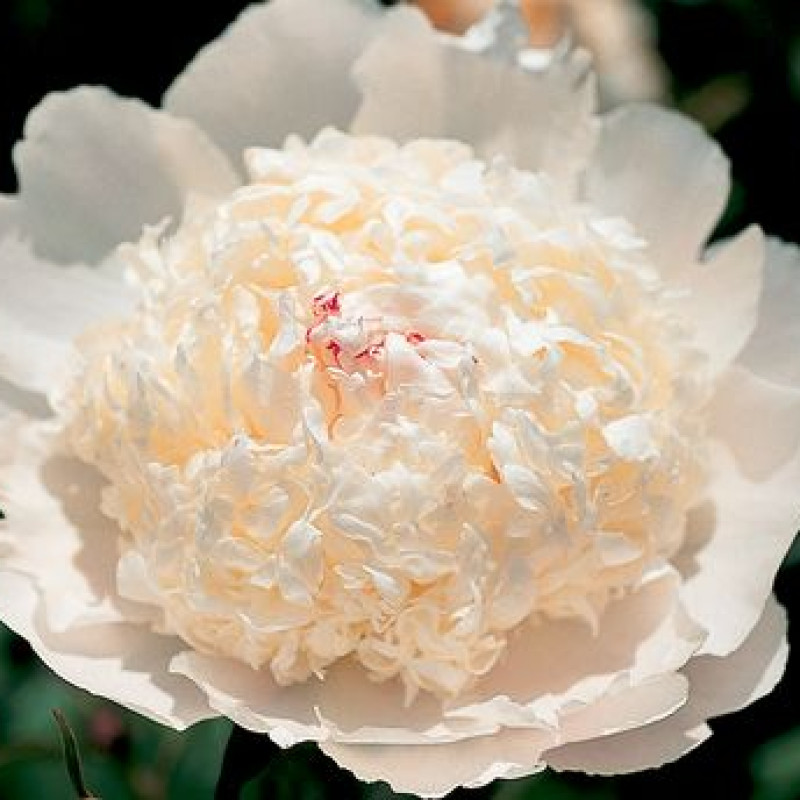 Махровый. Цветок жемчужно-белый. Лепестки хорошей плотной текстуры, центральные лепестки с красными кончиками. Приятный аромат. Высота 85 см. Стебли сильные, с тёмно-зелёной листвой. На стебле по 4 цветка. Срок цветения ранний.