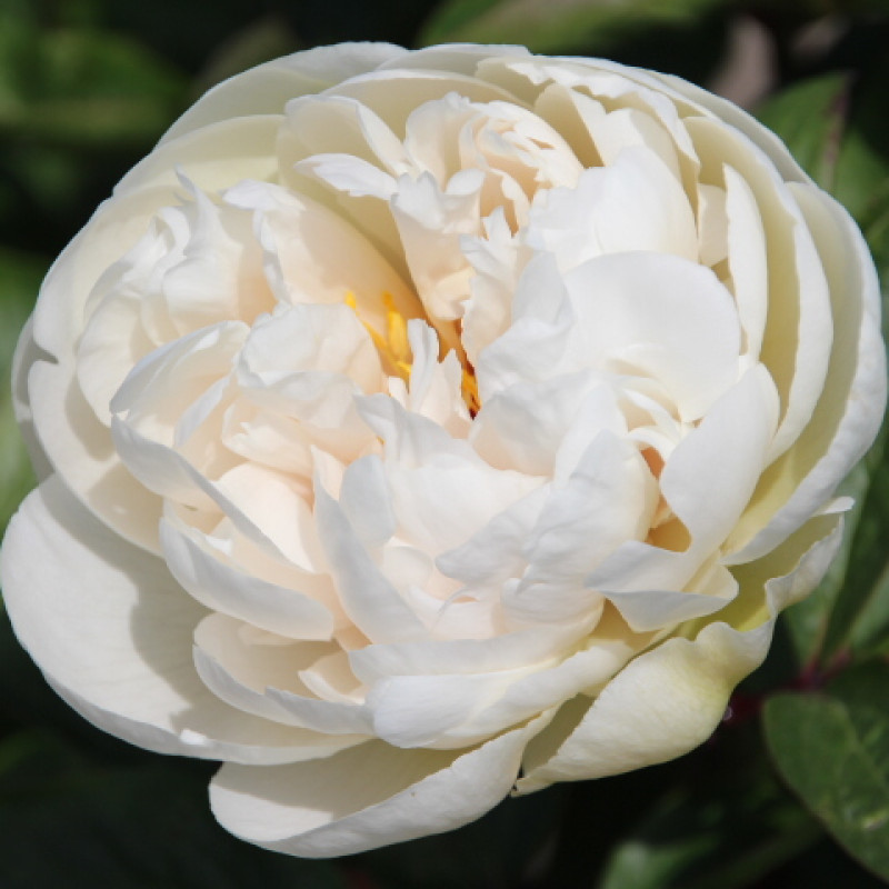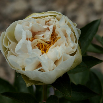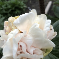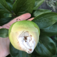 В начале роспуска бутон окрашен в нежно-салатовый цвет, бутон раскрывается кремово-белым цветом, центральные лепестки закручиваются во внутрь к золотистым тычинкам. Очень необычный и редкий пион.