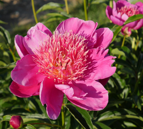 Японской формы. Окружные лепестки темно-розового насыщенного цвета. В центре шапочка из смеси темно-розовых и персиковых петалодий. Бутоны распускаются над листвой. Яркий. Прекрасная листва.