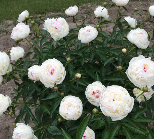 Молочноцветковый пион. Цветок махровый, бомбовидной формы. Соцветия белые, центр белый с несколькими малиновыми мазками и со свечением желтого на внутренних лепестках. Этот сорт станет вашей семейной реликвией! Обладает приятным ароматом розы.