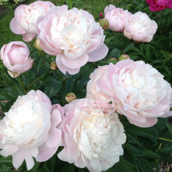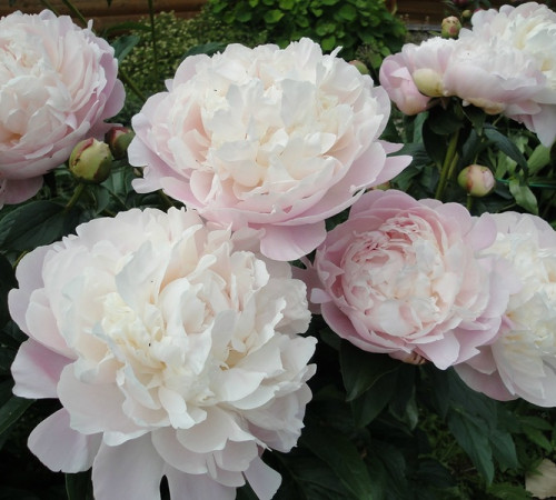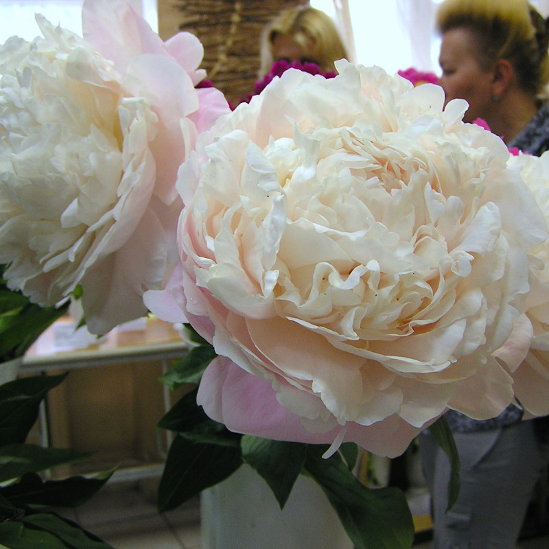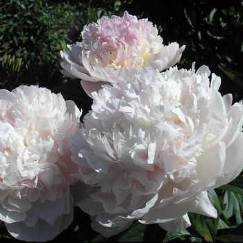 Молочноцветковый пион. Средне-позднего срока цветения. Цветок белый, края лепестков кремово-розовые лишь в начале цветения, в полном роспуске цветок становится белоснежным. Ароматный. Стебель сильный с крупными зелеными листьями.