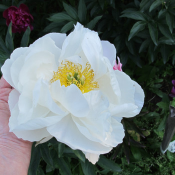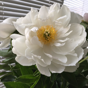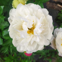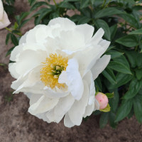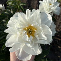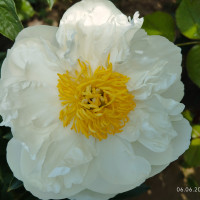 Молочноцветковый пион. Ранне-среднего срока цветения. Цветок полумахровый. Распускается со светло-розовыми внешними петалодиями, потом становится чисто белым. Тычинки желтые. В сезон дождей иногда в центре цветка появляются дополнительные белые лепестки. Куст полушаровидный, крепкий с прочными стеблями. Сорт ароматный, цветение обильное и продолжительное.
