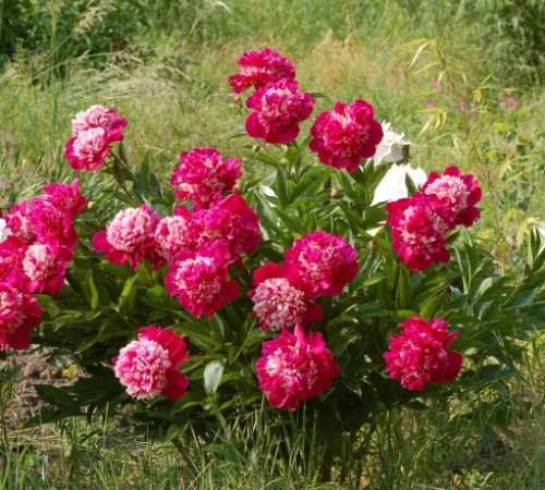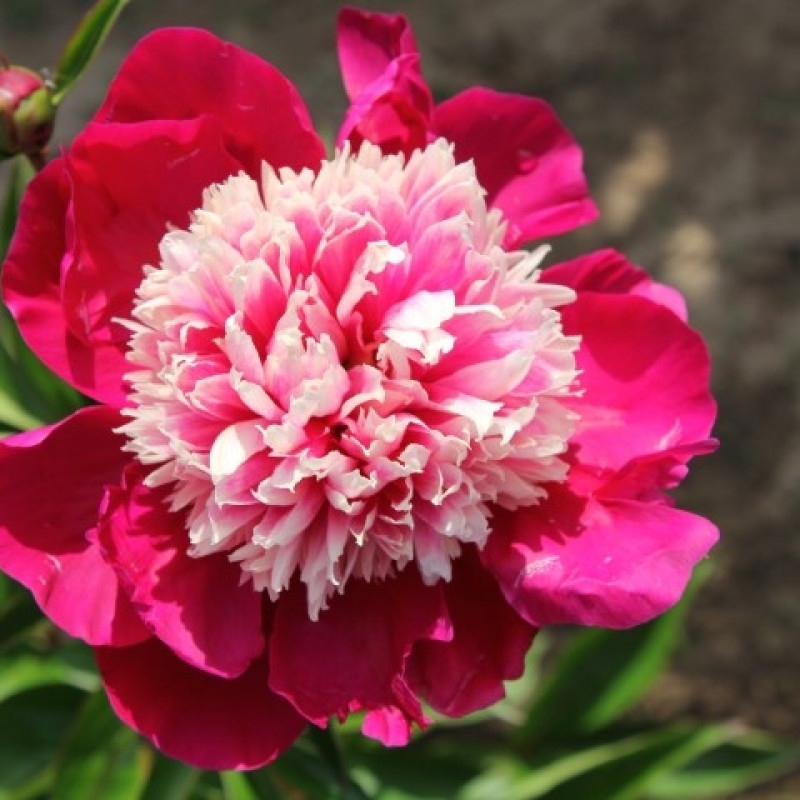 Молочноцветковый пион. Средне-позднего срока цветения. Цветок японского типа с темно-карминно красным венчиком. В центре цветка шар который состоит из кремово-розовых стаминодий.