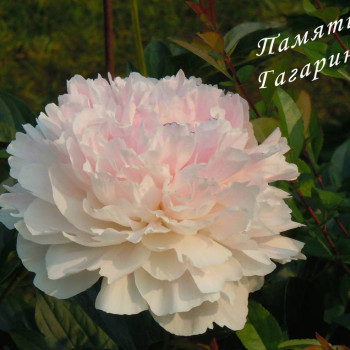 Памяти Гагарина - Pamyati Gagarina. (Краснова Н.С., 1957, СССР). Травянистый. Сорт от p. lactiflora. Махровый розовидный. Светло - розовый, с насыщением к центру. Тычинки возможны. Пестики с недоразвитыми красными рыльцами. Стебли прочные. Листья блестящие, тёмно - зелёные. Ф=18 см. Н=80 см. Ароматный. Средний срок цветения.