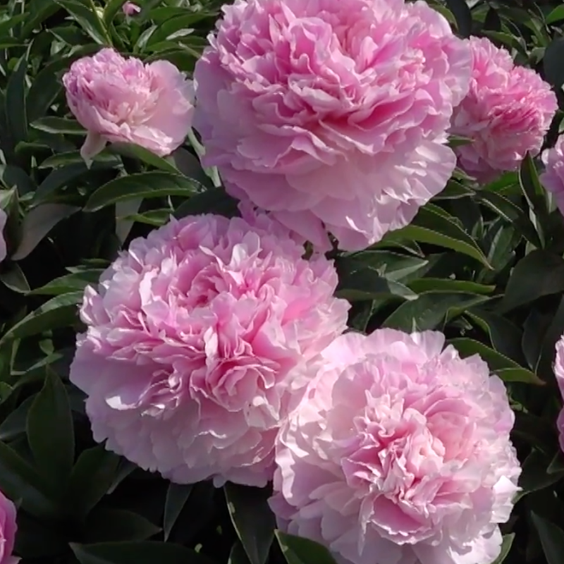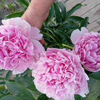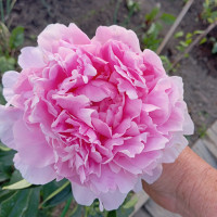Очень позднего срока цветения. Цветок огромный!! Тяжелый, густомахровый, перламутрово-розовый, к краям лепестки чуть светлее, стебли крепкие. Сорт обильно и продолжительно цветет.