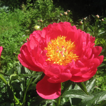 Безумно-красивый яркий малиново-красный цвет наружных лепестков эффектно контрастирует с золотистыми тычинками.Пестики светло-зеленые, рыльца окрашены в тон лепесткам. Цветок по форме схож с сортом Coral Charm, но совершенно другого фантастического малинового цвета. Куст эффектный, мощный, до 90 см высотой.
