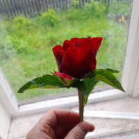 Цветок полумахровый, насыщенного красного цвета с округлыми атласными лепестками.