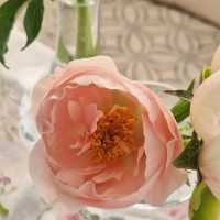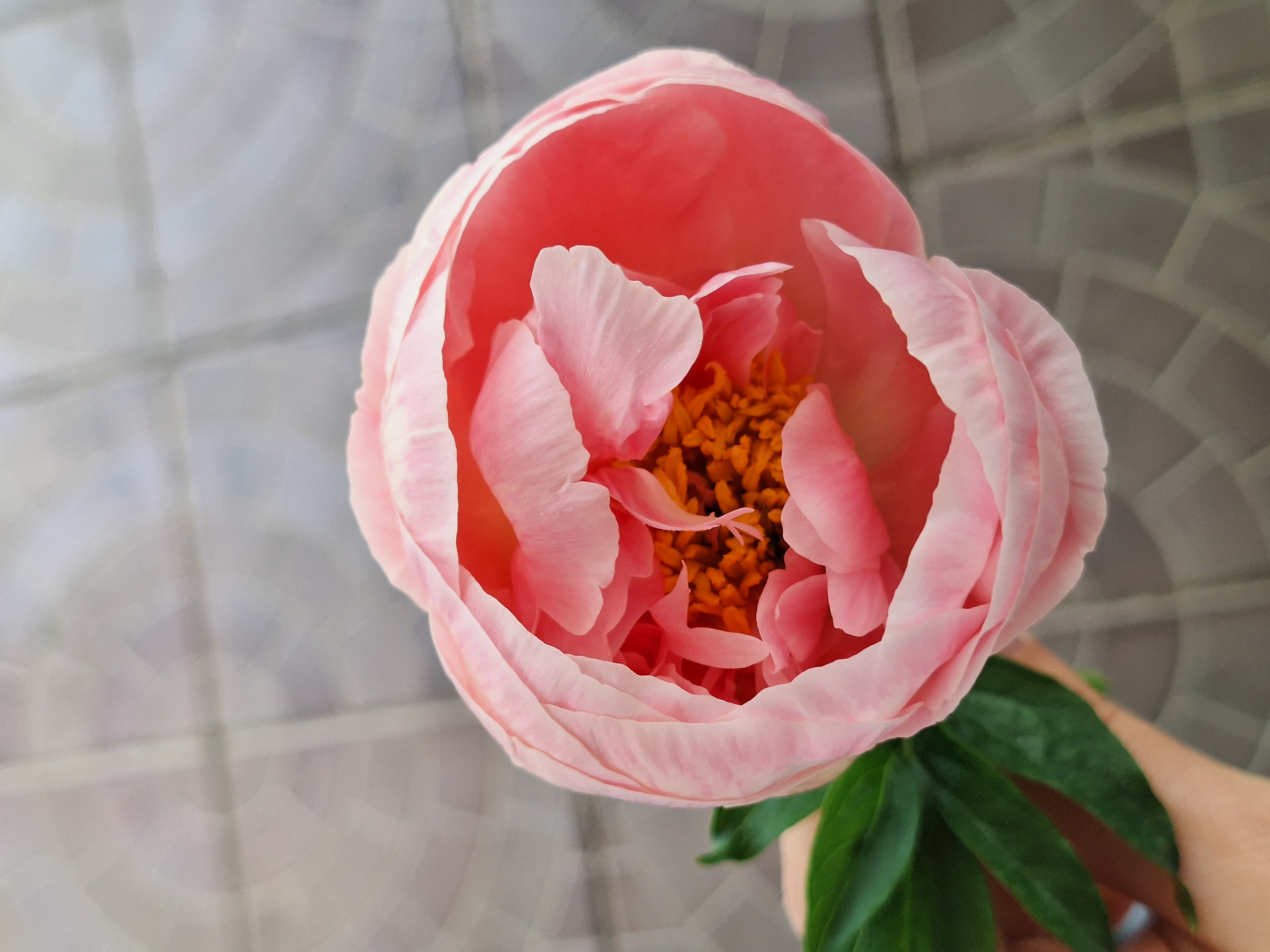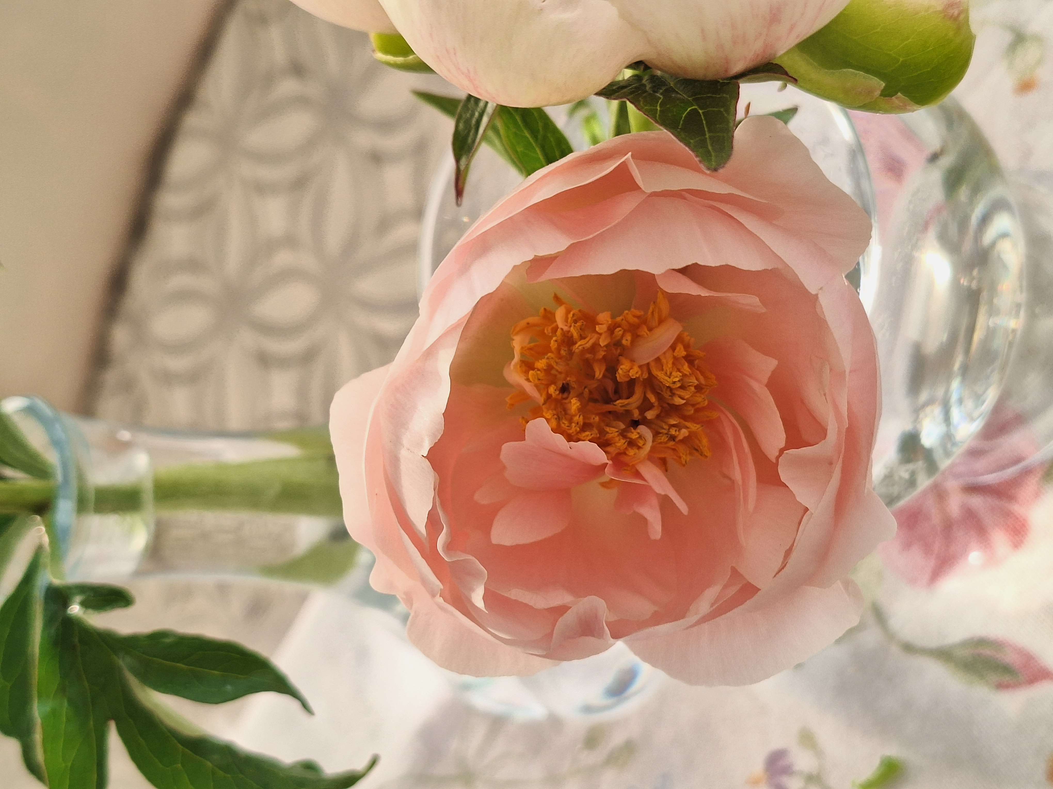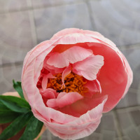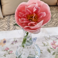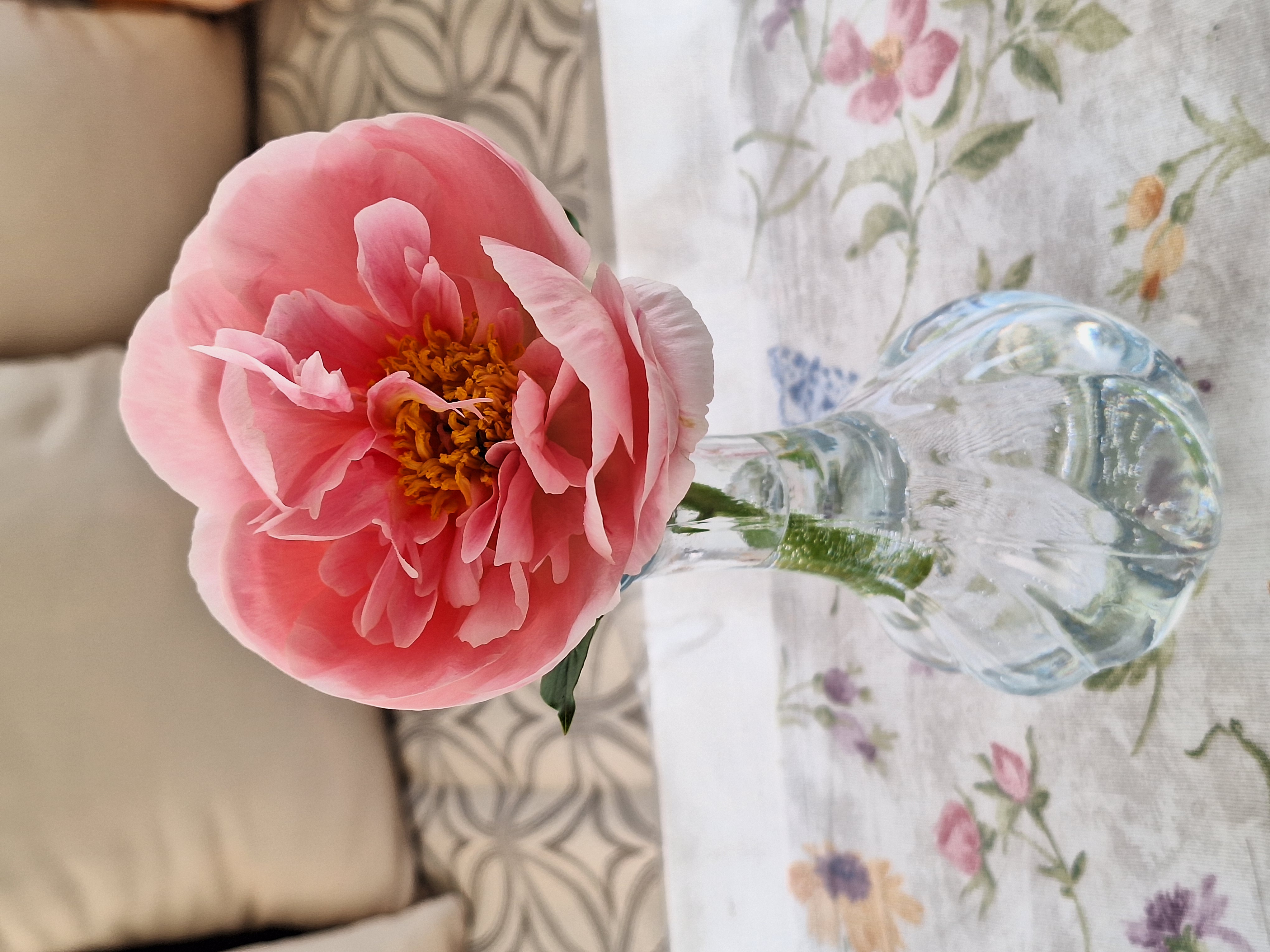 В декабре 2023 года заказала 8 корней пионов на осень 2024 года. Очень переживала, ведь среди заказа были и корни за 8 тысяч рублей (Pastelegance). Качество полученных корней было великолепным, количество почек в некоторых случаях даже больше заявленных. И вот весной 2025 года 3 из 8 посаженых пионов зацвели (я обрывала бутоны, но оставила по одному для проверки сорта). Сорт Salmon Dream зацвел 5 июня и был тут же срезал с короткой ножкой и отправлен в вазу. В итоге оказалось, что у этого сорта осталось 2 бутона, второй тоже отправился в вазу 7 июня. Стоял в срезке 3 дня, аромат специфический, как у всех пионов коралловой и лососевой группы: для меня запах меняется от ароматизатора зеленого чая в начале цветения до гниющего мяса к концу цветения. Лепестки снаружи имеют более светлую окраску с розовыми штрихами, сам цветок выглядит за счёт этого будто сделан из холодного фарфора.