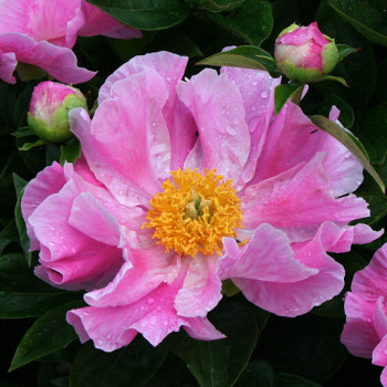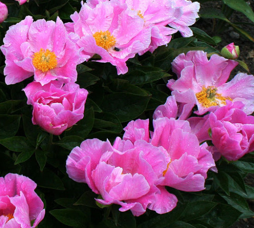 Яркие розовые простой формы цветы с небольшими золотыми тычинками в центре. Два ряда лепестков образуют открытую чашу вокруг золотого центра. Лепестки широкие, рифленые. За счет своего небольшого роста и компактности идеален для ландшафтного дизайна. Куст не разваливается, не бьется дождем.