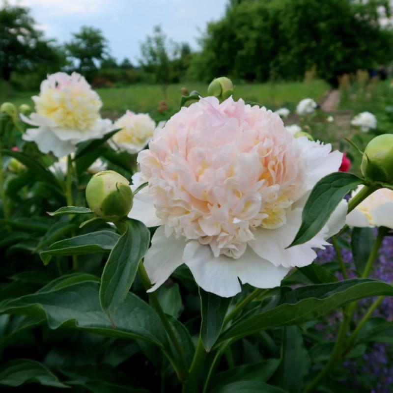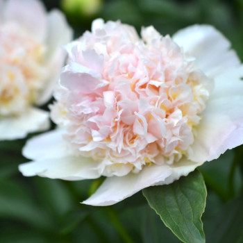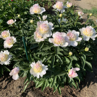 Очень нежный и необычный цветок. Трёхцветный, внешние лепестки крупные чуть розовые или белые, открывается как анемоновидный, затем в центре вырастает розовый шар, в середине цветка образуется корона из ярко-жёлтых петалодиев, стебли прочные.
