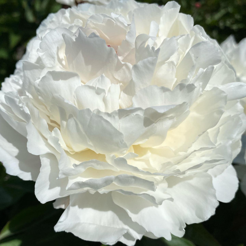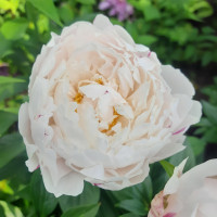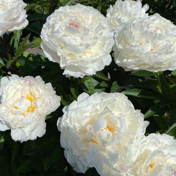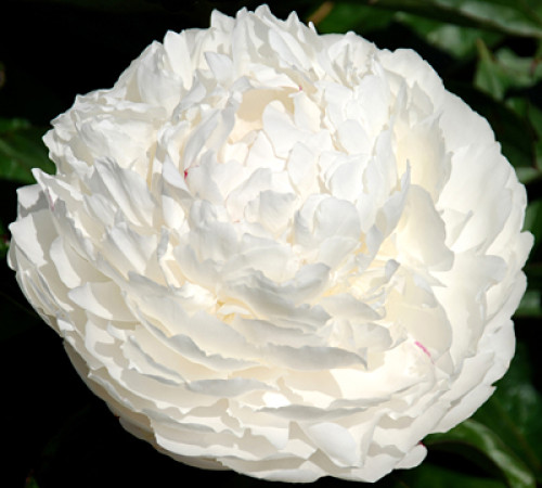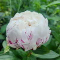 Махровый пион, впервые зацветший в 1996 году. Белый, идеально сложенный цветок с красной каймой по центральным лепесткам. Внешние лепестки отлично удерживают бутон, поэтому цветок не теряет своей формы даже при полном роспуске. Крепкие стебли.