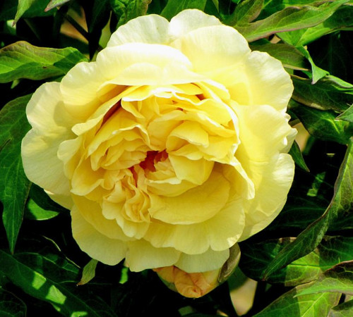 Цветок жёлтый с лавандовыми пятнышками в центре и с лепестками, похожими на лепестки водяной лилии. Стебли очень прочные, к осени листья приобретают бронзовый оттенок, листья ажурные.