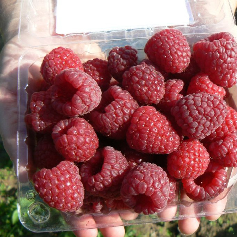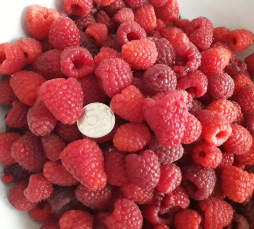 Кусты слабораскидистые, в высоту они достигают двух метров. Побеги мощные и плоды не наклоняют их вниз. По размерам ягоды вполне соответствуют своему названию. Средний вес – 6-10 грамм, но некоторые экземпляры достигают 15 грамм. Они конусообразные, окрашены в яркий рубиновый цвет. Плоды плотные, но сочные, обладают приятным кисло-сладким вкусом и выраженным малиновым ароматом. С одного куста собирают 2,5-4 килограмма ягод.