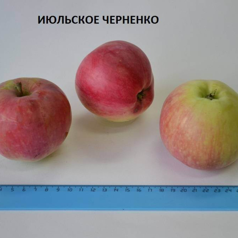 Яблоки, как правило, среднего размера, вес каждого плода способен варьироваться от 120 до 180 г. Форма слабоуплощенная, округло-коническая. Некоторые плоды имеют шов, эта особенность свойственна сорту Папировка, который принимал участие в скрещивании. Основной окрас яблок светло-зеленый, покровный малиновый окрас с полосками более насыщенных тонов. Имеется тонкий, но плотный восковой налет, едва заметный. Плодоножка короткая. Мякоть хрустящая и в меру плотная, имеет насыщенный аромат и винно-сладкий вкус. Список опылителей смотрите в фотогалерее.
