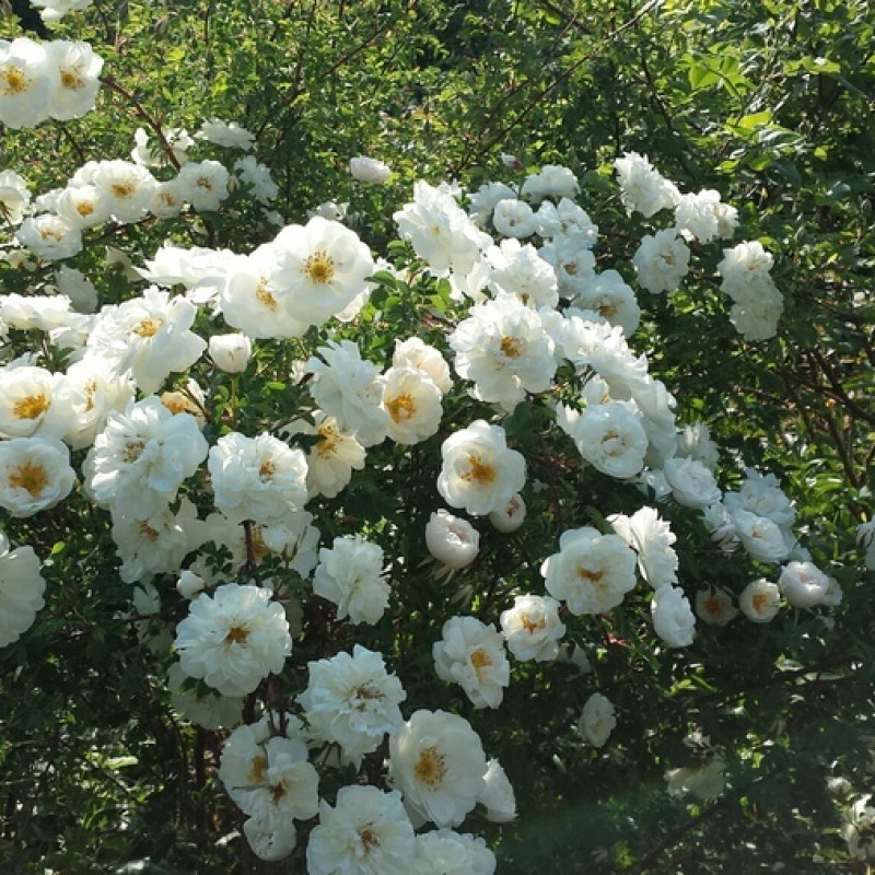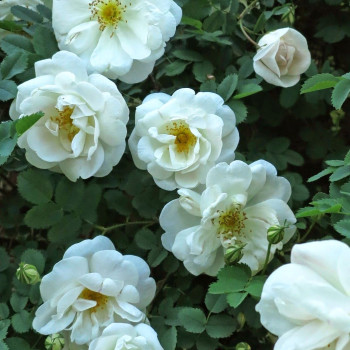 Цветки диаметром 5-7 см, полумахровые, в небольших соцветиях, издали кремово-белые с жёлтыми тычинками, вблизи заметен лёгкий розоватый оттенок. Аромат сильный. Цветение раннее, в июне, однократное, обильное. Хорошо растёт в полутени, на бедных сухих почвах.