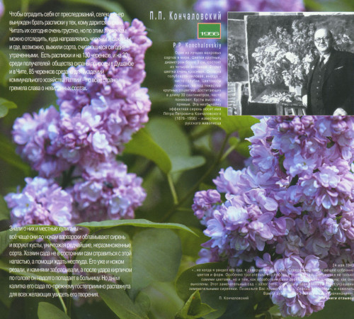 Syringa vulgaris 1956 Колесников D IV-III Один из лучших голубых махровых сортов в мире! Бутоны густо-лиловые. Цветки крупные, диаметром более 3см, состоят из 4-х! венчиков, с тонким ароматом. Форма цветка очень красивая. Лепестки широкоокрулые, верхние изогнуты. Окраска голубовато-лиловая, иногда - чисто голубая. Цветоносы прочные, но под тяжестью крупных соцветий, достигающих в длину 30 см и состоящих из 2-3 пар плотных, широко-пирамидальных метёлок, часто поникают. Листья крупные, тёмно-зелёные, заострённо-удлинённые. Кусты высокие, прямые, раскидистые. Цветёт обильно, в средние сроки. Эта необычайно эффектная редкая сирень носит имя Петра Петровича Кончаловского (1876-1956) - известного русского живописца, который дружил с Колесниковым и мастерски писал сирень. (Т. Полякова - из кн. «Время сирени», с. 80-81.). Эта сирень входит в семёрку лучших сортов Мировой коллекции, принадлежащих к голубоватым сиреням III группы.